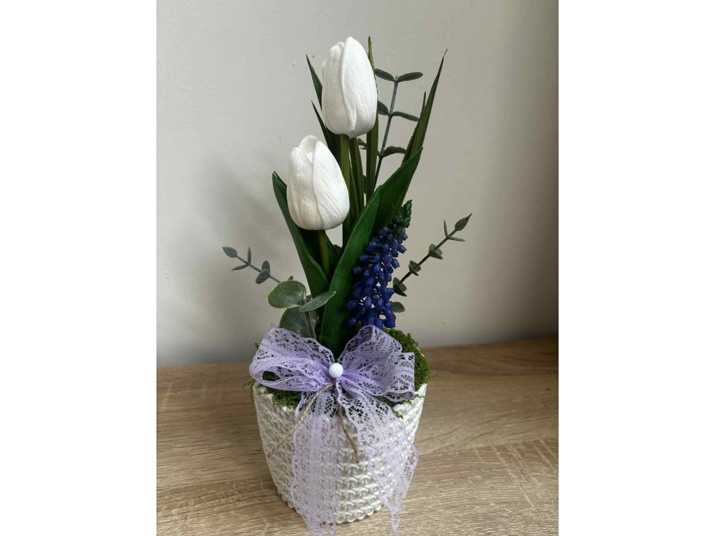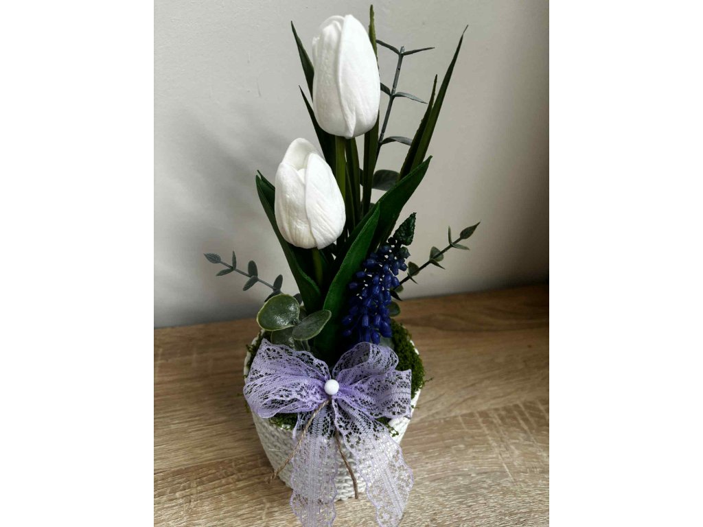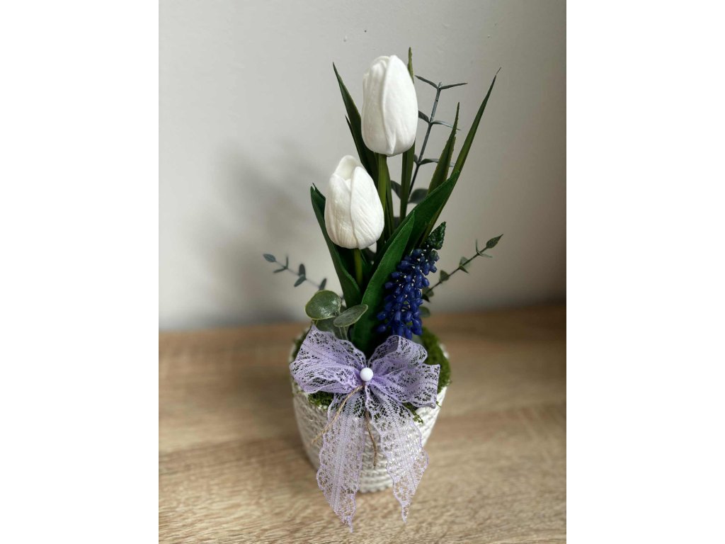 Hozd be a tavasz frissességét és színeit az otthonodba ezzel a fehér és lila tulipános tavaszi dekorációval! 🌼🌿 A pasztell árnyalatú tulipánok harmonikus kombinációja könnyed, elegáns megjelenést ad bármely helyiségnek — legyen az a nappali, étkezőasztal vagy polc. A virágos dekoráció egyszerű, mégis látványos designja ideálissá teszi asztali dísznek, ajándéknak vagy szezonális kiegészítőnek a tavaszi időszakban.